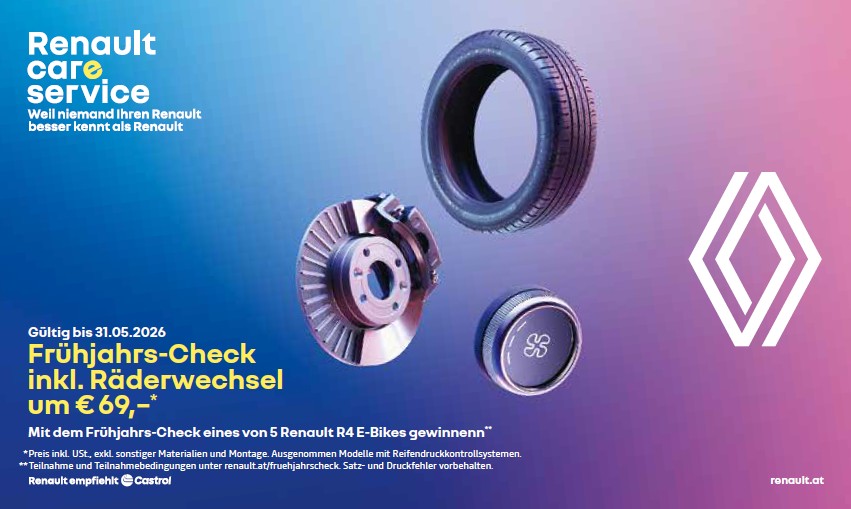 * Preis inkl. USt., exkl. sonstiger Materialien und Montage. Ausgenommen Modelle mit Reifendruckkontrollsystemen. ** Teilnahme und Teilnahmebedingungen unter renault.at/fruehjahrscheck. Satz- und Druckfehler vorbehalten. Impressum: Medieninhaber: Renault Österreich GmbH, Laaer-Berg-Straße 64, 1100 Wien, Hersteller: 08/16 Printproduktion GmbH, 1090 Wien.